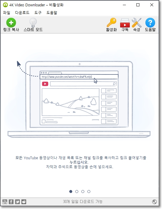4K Video Downloader 한글판 다운로드 사이트에서 설치했기 때문에, 곧바로 한글이 적용된 모습입니다.