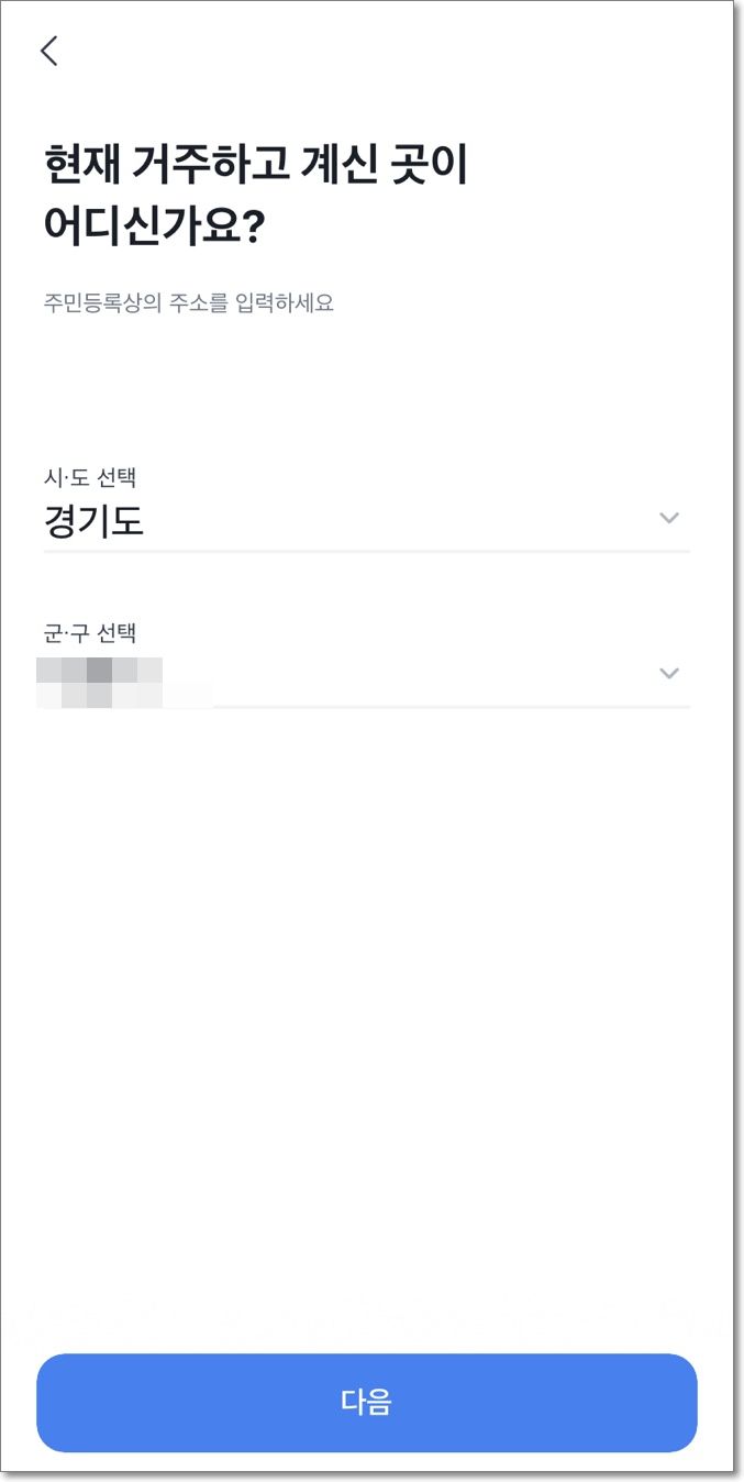 '내 지원금 확인하기'를 터치하였으면, 현재 거주지역을 선택하라고 하는데요. 토스(TOSS) 숨은 정부지원금 찾기에서는 지자체에서 제공해주는 복지혜택까지도 한 번에 조회해볼 수 있기 때문에, 거주 지역도 입력해 주어야 합니다.